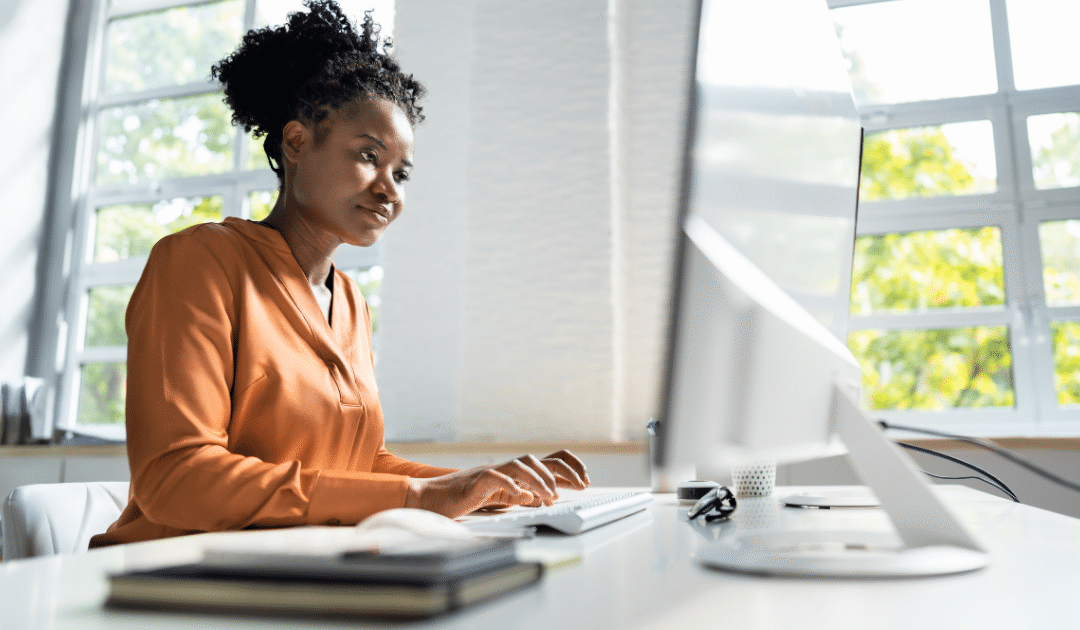 A dedicated virtual assistant focuses on work at a well-lit office desk, highlighting the efficiency and professionalism that VA services bring to businesses. Perfect for showcasing the impact of outsourcing tasks to streamline operations and enhance productivity.